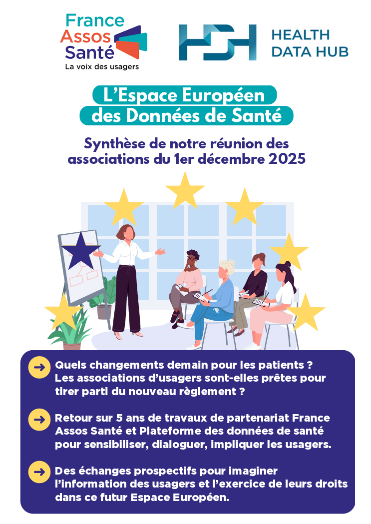 Le 1er décembre 2025, France Assos Santé et la Plateforme des données de santé ont réuni une trentaine de représentants d’associations d’usagers à PariSanté Campus pour échanger sur l’Espace européen des données de santé (EEDS) et ses futures implications pour les patients en France. Pensée comme un premier temps de dialogue, cette rencontre visait à sensibiliser les associations, entendre leurs besoins et leurs inquiétudes, répondre aux questions et poser les bases d’une information claire et partagée sur l’EEDS.